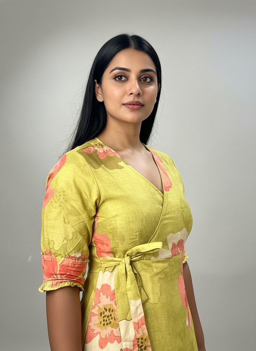 The faux wrap-style front and half puff sleeves bring subtle structure, while the ankle-length hem creates a balanced, elongated silhouette. Perfect for brunches, resort wear, or casual outings, this piece combines ease with quiet sophistication.