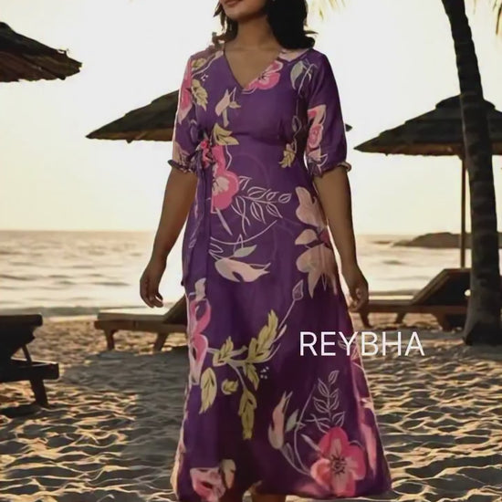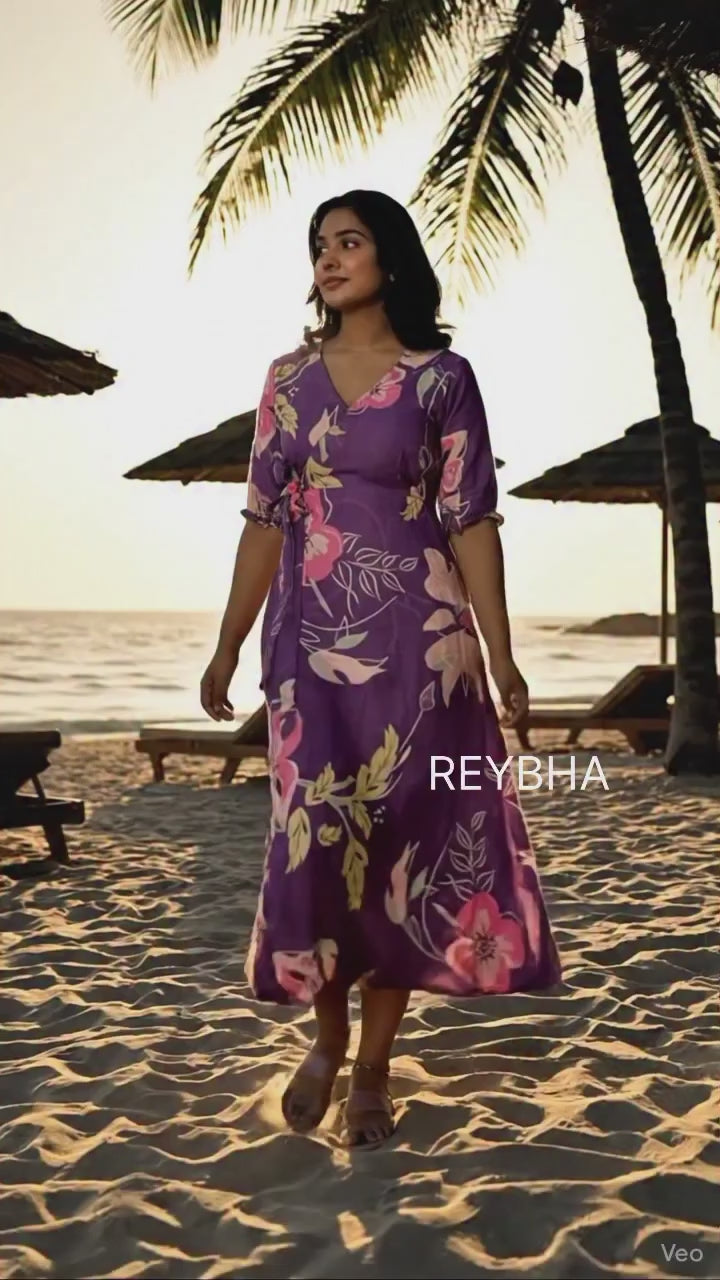The faux wrap-style front and half puff sleeves bring subtle structure, while the ankle-length hem creates a balanced, elongated silhouette. Perfect for brunches, resort wear, or casual outings, this piece combines ease with quiet sophistication.
